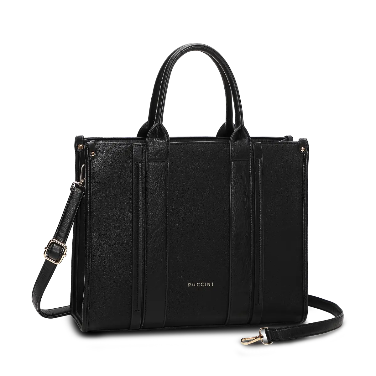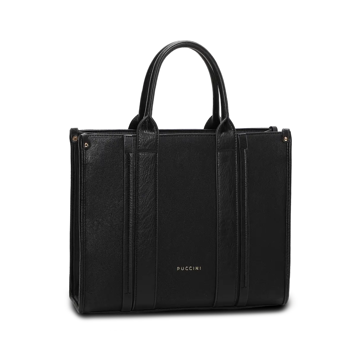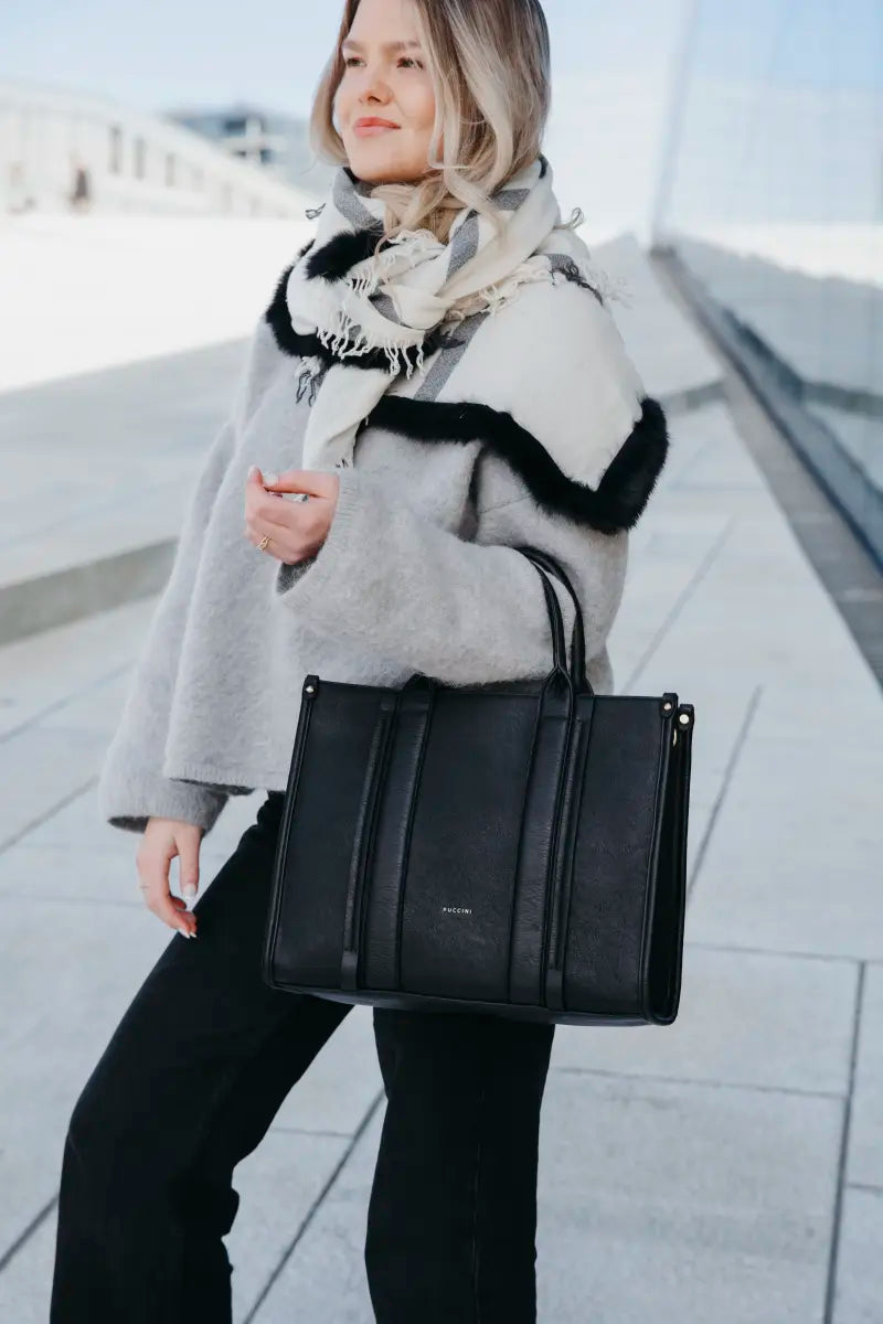 Puccini Linea Handväska är en trendig och generöst tilltagen handväska i klassisk kassemodell. Den är tillverkad i mjuk och följsam skinnimitation (PU) som både känns lyxig och är enkel att underhålla. Den rejäla botten gör att väskan står stadigt när du ställer den ifrån dig, vilket gör den perfekt för både arbete och vardag. Guldtonade metalldetaljer ger väskan en elegant finish som lyfter hela looken.