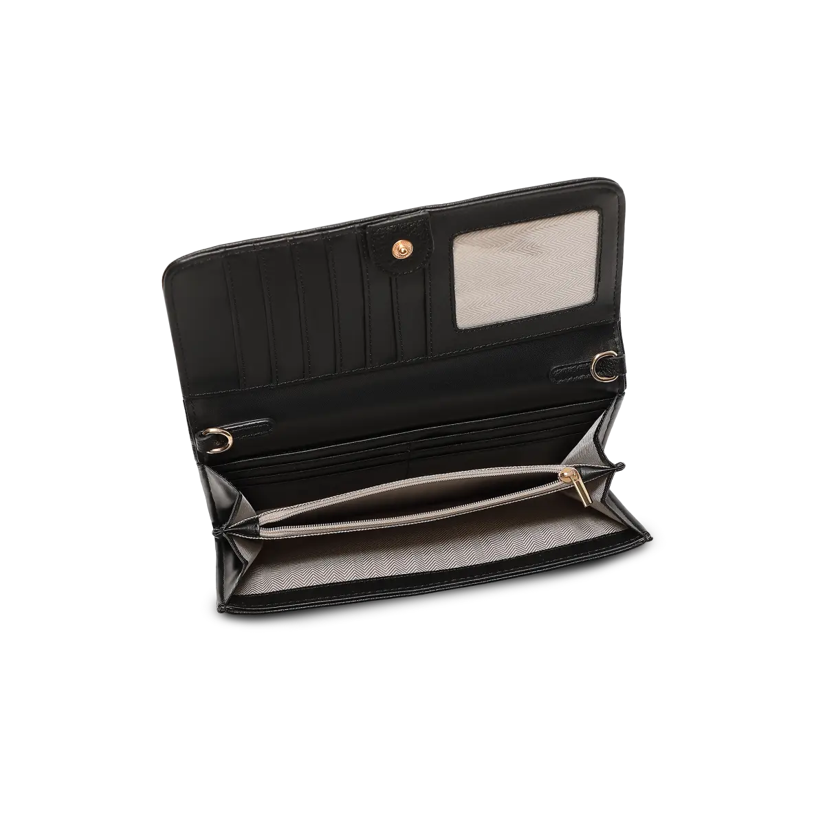 Insidan är noggrant utformad med sedelfack, ett mittfack med dragkedja och hela 13 kortfack – vilket gör att du enkelt kan organisera dina betal- och medlemskort. Den praktiska layouten gör att väskan fungerar utmärkt som både plånbok och mindre handväska för mobil och viktiga småsaker.