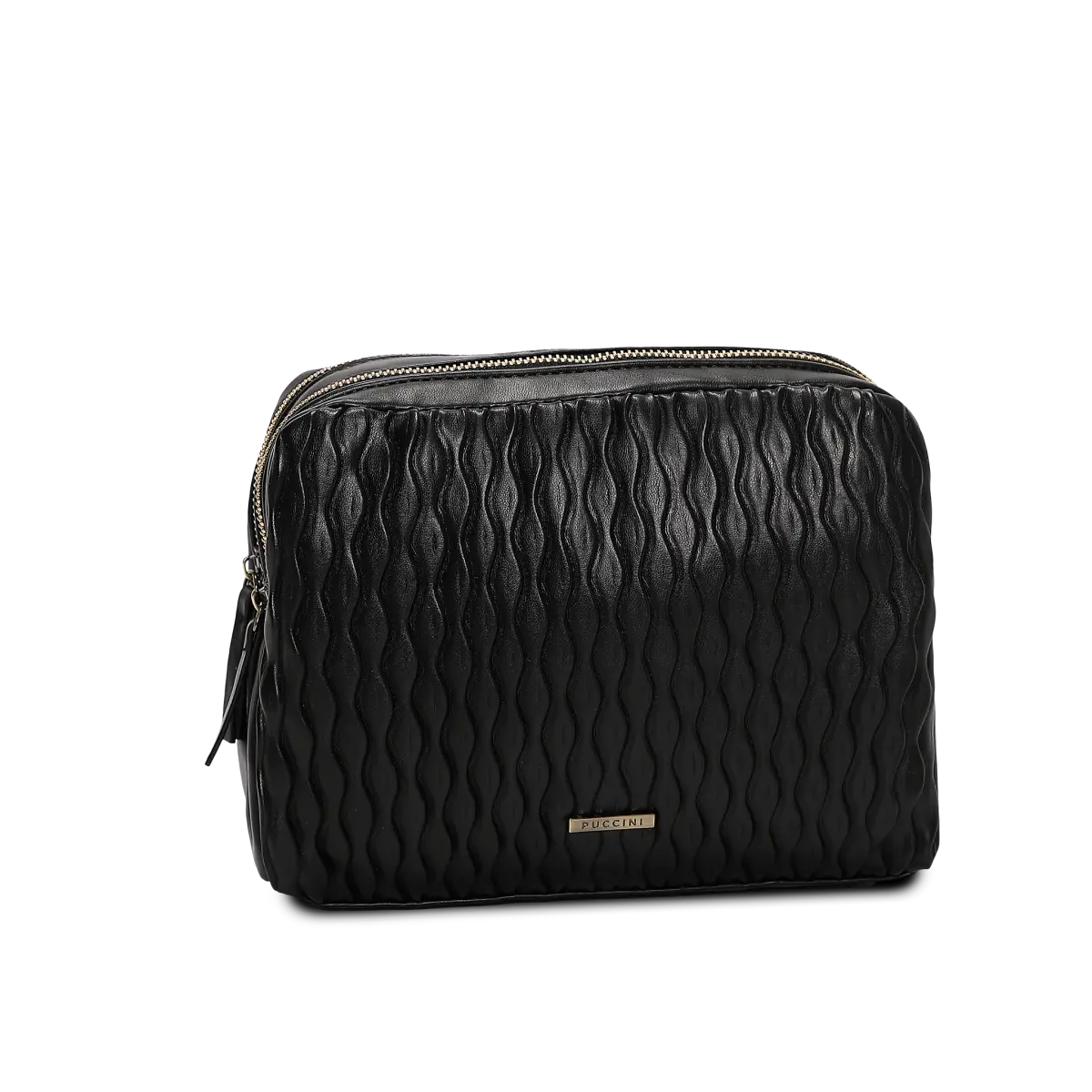 Puccini Suzana Necessär 24 cm är en elegant och praktisk necessär tillverkad i mjuk, veckad skinnimitation med en lyxig känsla. Den feminina designen och de antikguld-färgade metalldetaljerna ger väskan en tidlös stil som passar lika bra hemma som på resan. Perfekt för den som vill kombinera funktion med en sofistikerad look.