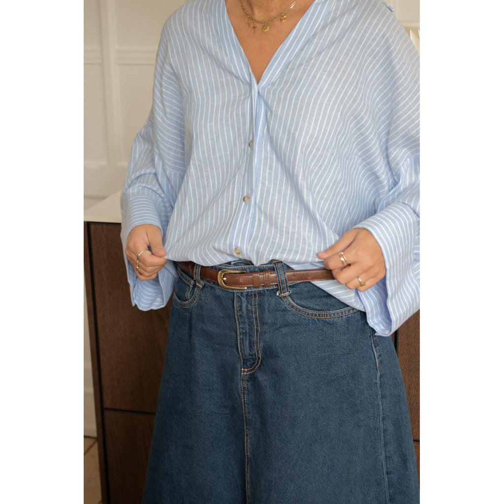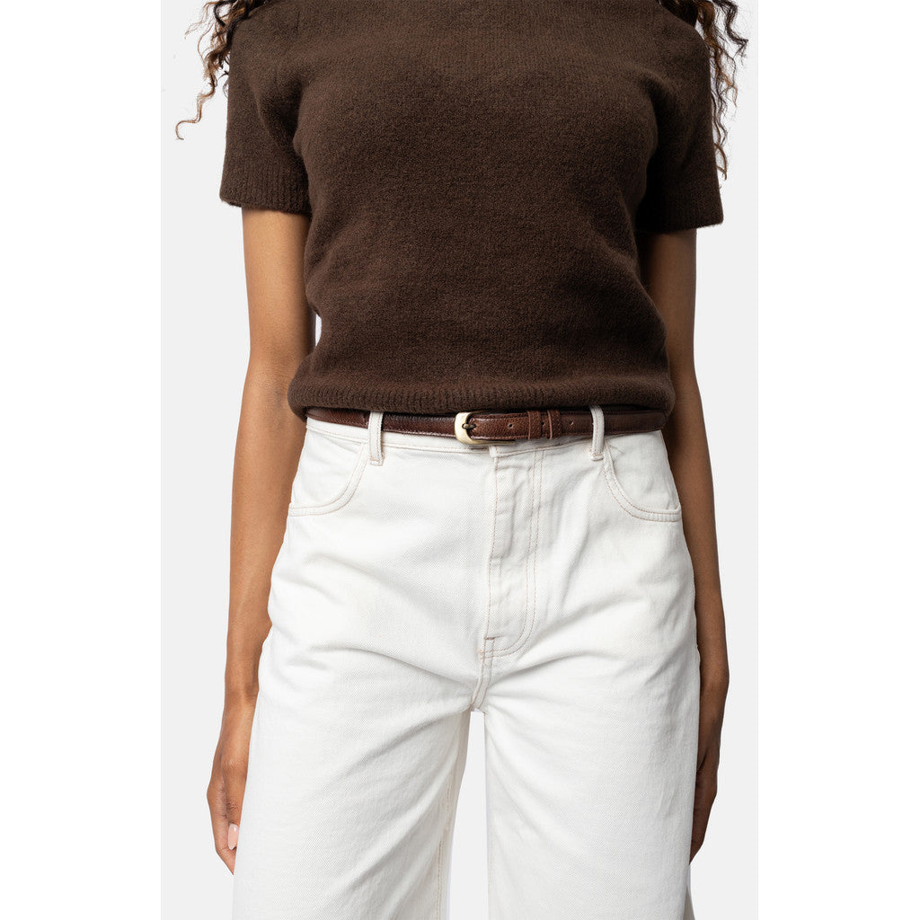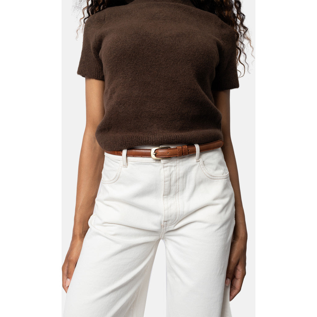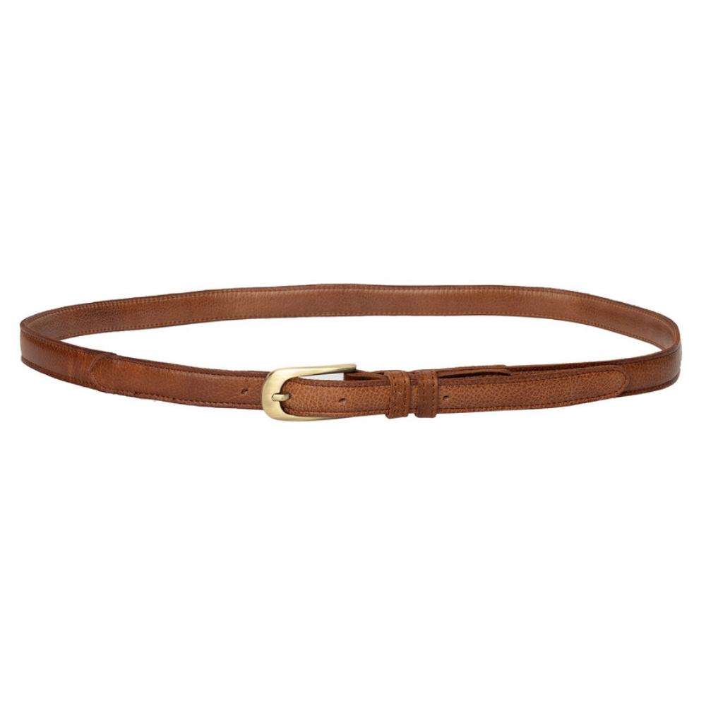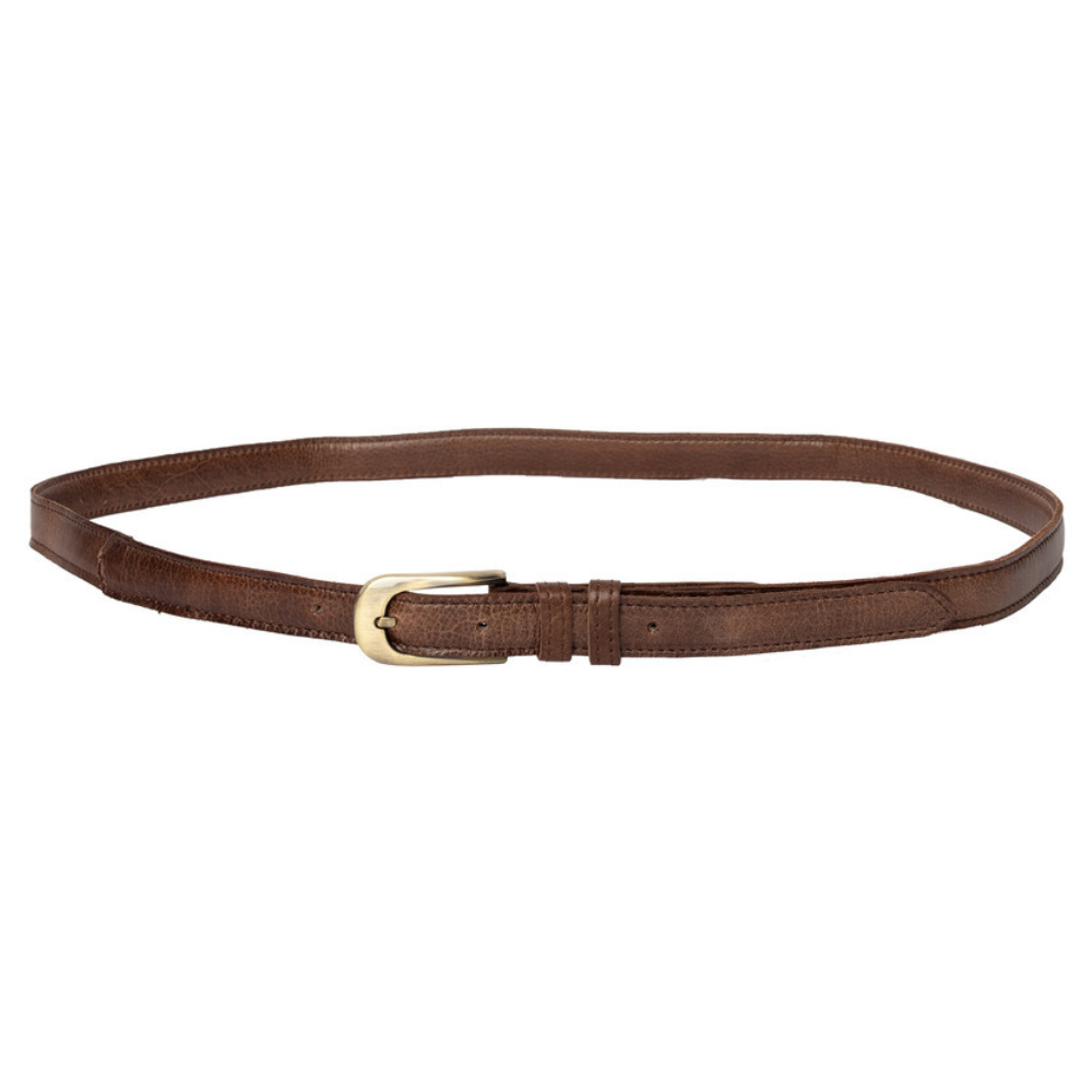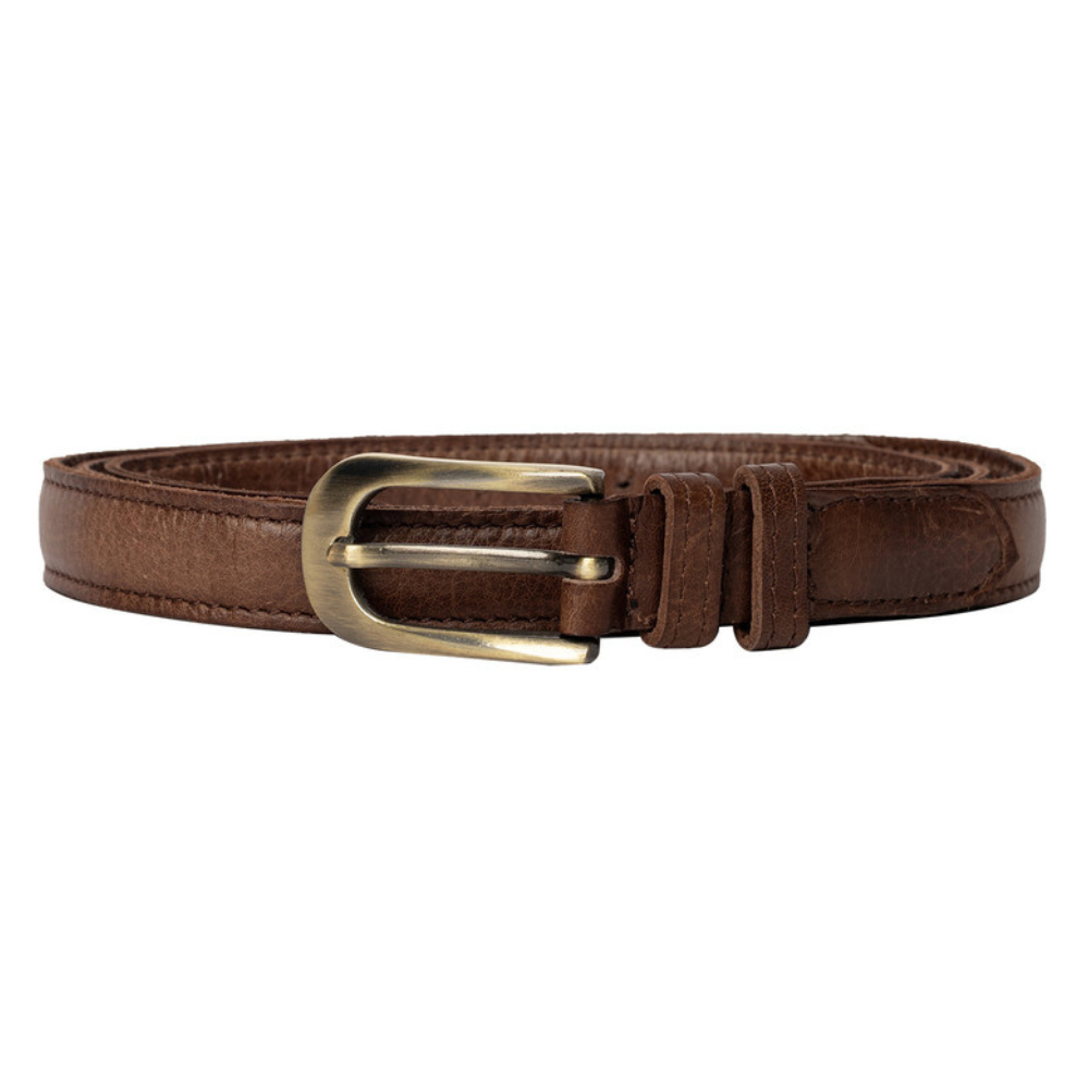 Mona-bältet är 2 cm brett och finns i längder mellan 90–110 cm, vilket gör det enkelt att anpassa till olika midjemått och klädstilar. Det smala formatet gör det särskilt passande till klänningar, kjolar och tunna byxor, samtidigt som det skapar en balanserad och elegant siluett. Spännet i guldton ger en vacker kontrast till det naturliga lädret och bidrar till den exklusiva känslan.