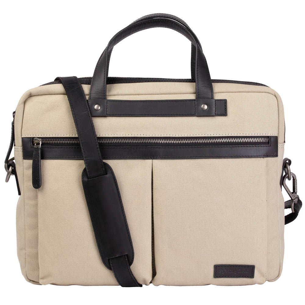 Springfield Organic datorväska är en klassisk briefcase i 100% canvas med stilrena detaljer i skinn. Med sina mått på 39 × 29 × 9 cm har väskan ett smidigt format som gör den enkel att bära till både arbete och studier. Den är utrustad med dubbla handtag i skinn för ett bekvämt grepp samt en lång, justerbar axelrem som gör att väskan även kan bäras crossbody eller över axeln. På både fram- och baksidan finns praktiska fack för snabb åtkomst till dokument och tillbehör.