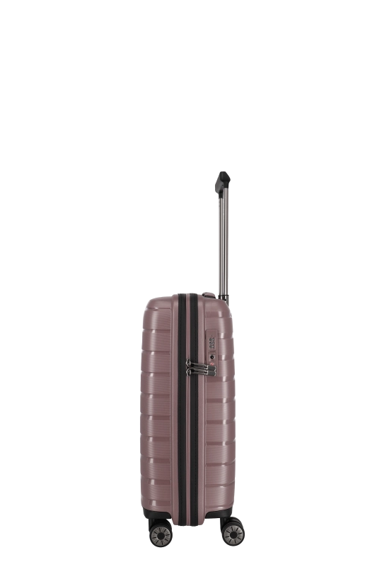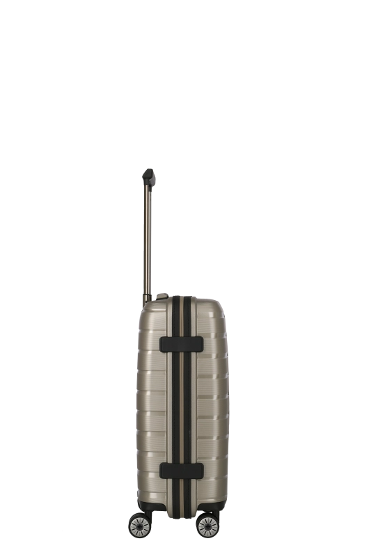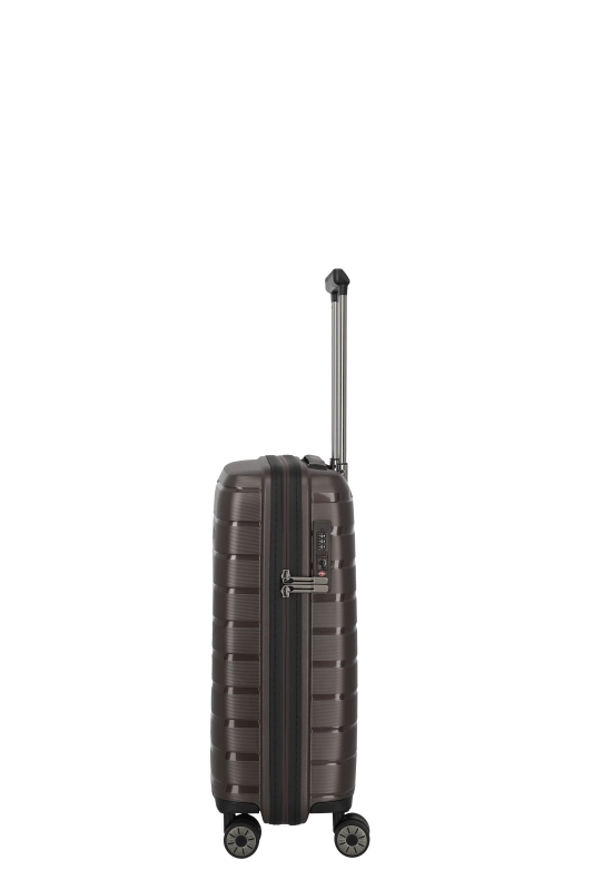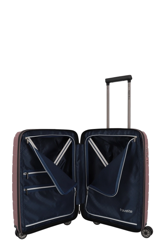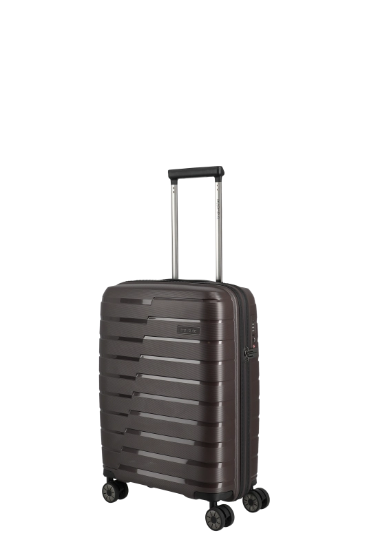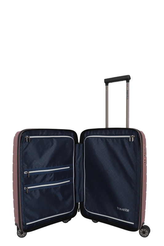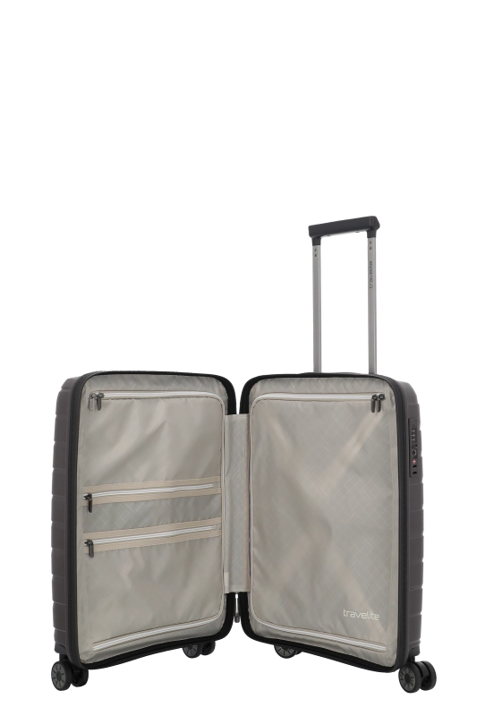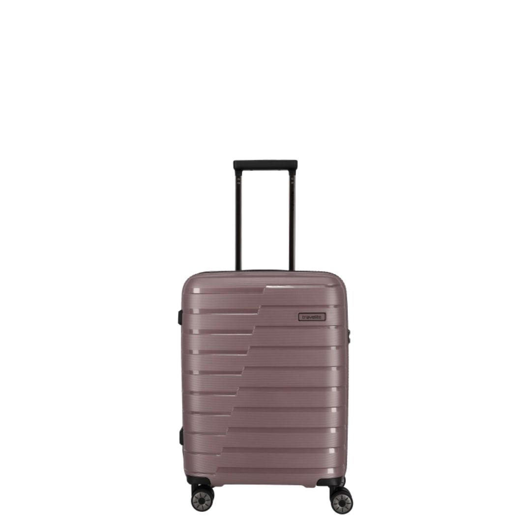 Denna hårda kabinväska från Travelite erbjuder en robust och stilren design i polypropen. Med ett bärhandtag och ett vattentätt, låsbart tvåvägsblixtlås, säkerställs både skydd och säkerhet under resan. Väskan är utrustad med ett tvåarmad låsbart teleskoprör och ett TSA-kombinationslås, vilket underlättar vid bagagekontroll. De fyra 360° tystgående dubbelhjulen bidrar till enkel manövrering, vilket gör den idealisk för smidiga förflyttningar.