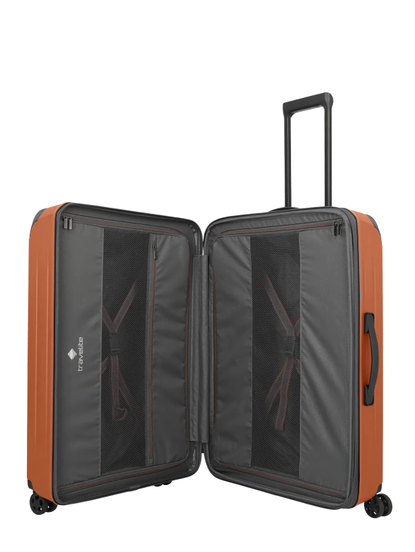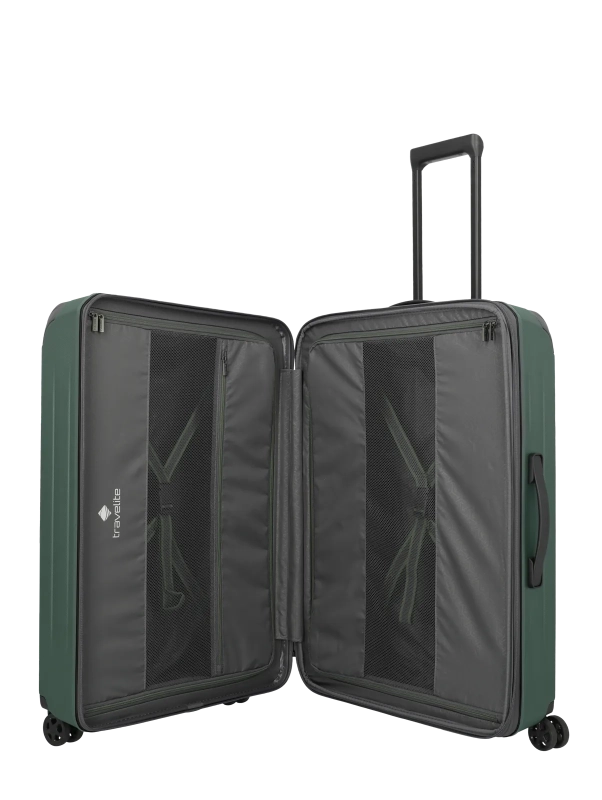 Väskan är utrustad med en låsbar teleskophandtag i lättmetall och fyra dubbelhjul som rullar mjukt i alla riktningar. Det integrerade TSA-kombinationslåset ger trygghet under hela resan, medan de ergonomiska bärhandtagen på toppen och undersidan underlättar lyft och lastning. Med Travelite Dynamiic reser du bekvämt, organiserat och med stil – varje gång.