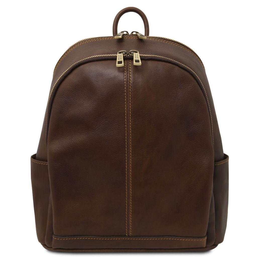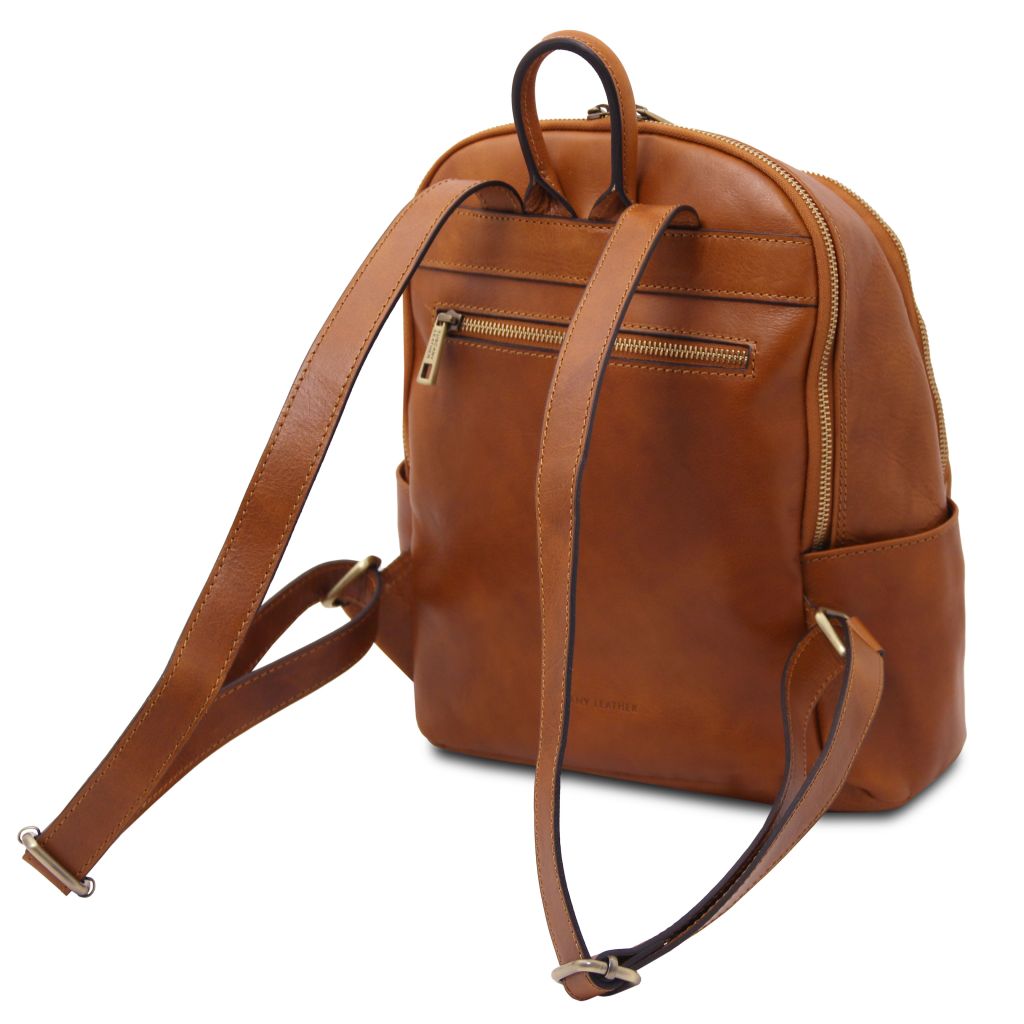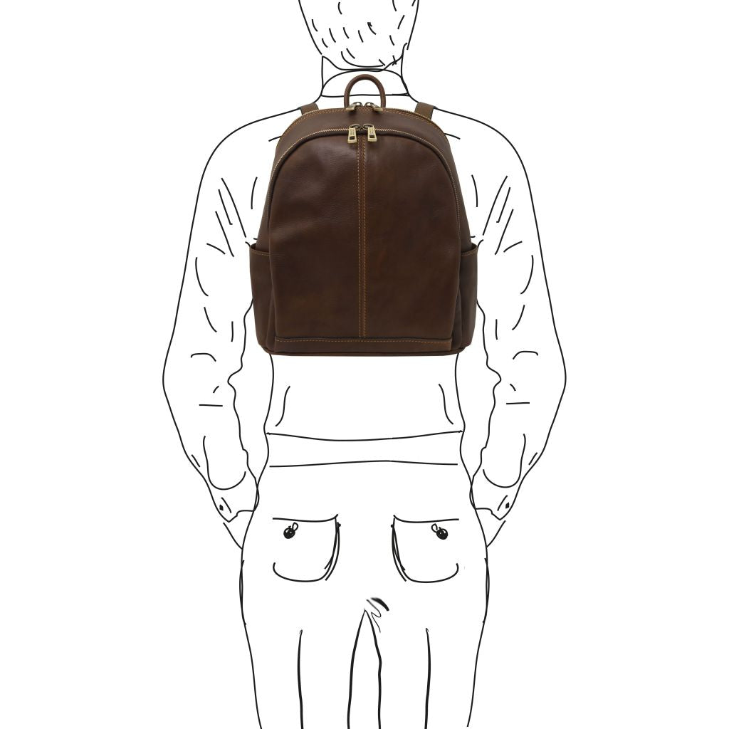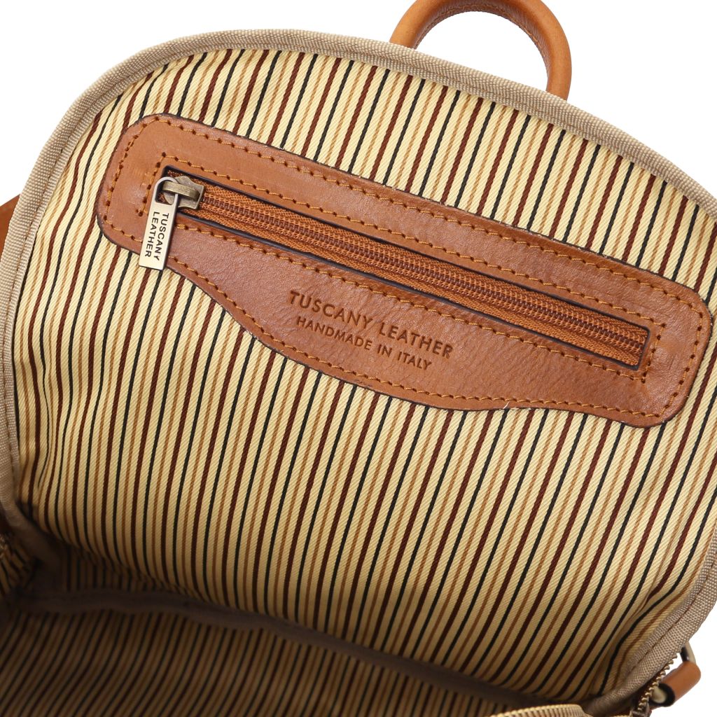 Tuscany Leather Canberra är en ryggsäck i matt fullnarvat handbetsat vegetabiliskt garvat läder som kombinerar klassisk italiensk elegans med praktisk funktionalitet. Den halvstyva strukturen gör att väskan behåller sin form och ger ett sofistikerat uttryck. Utsidan har två öppna sidofickor, en bakficka med stängning samt en varmpräglad Tuscany Leather-logotyp som understryker hantverket.