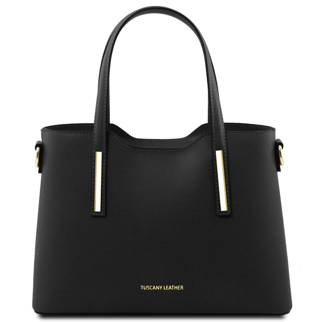 Tuscany Leather Olimpia Small är en sofistikerad handväska tillverkad i box smooth-läder med en fast struktur som ger en elegant och formstabil siluett. Väskan har en klassisk design med gyllene logoprägling på framsidan, skyddande metallfötter undertill och detaljer i guldton som skapar en lyxig finish. En tidlös modell som passar lika bra till arbete som till fest.