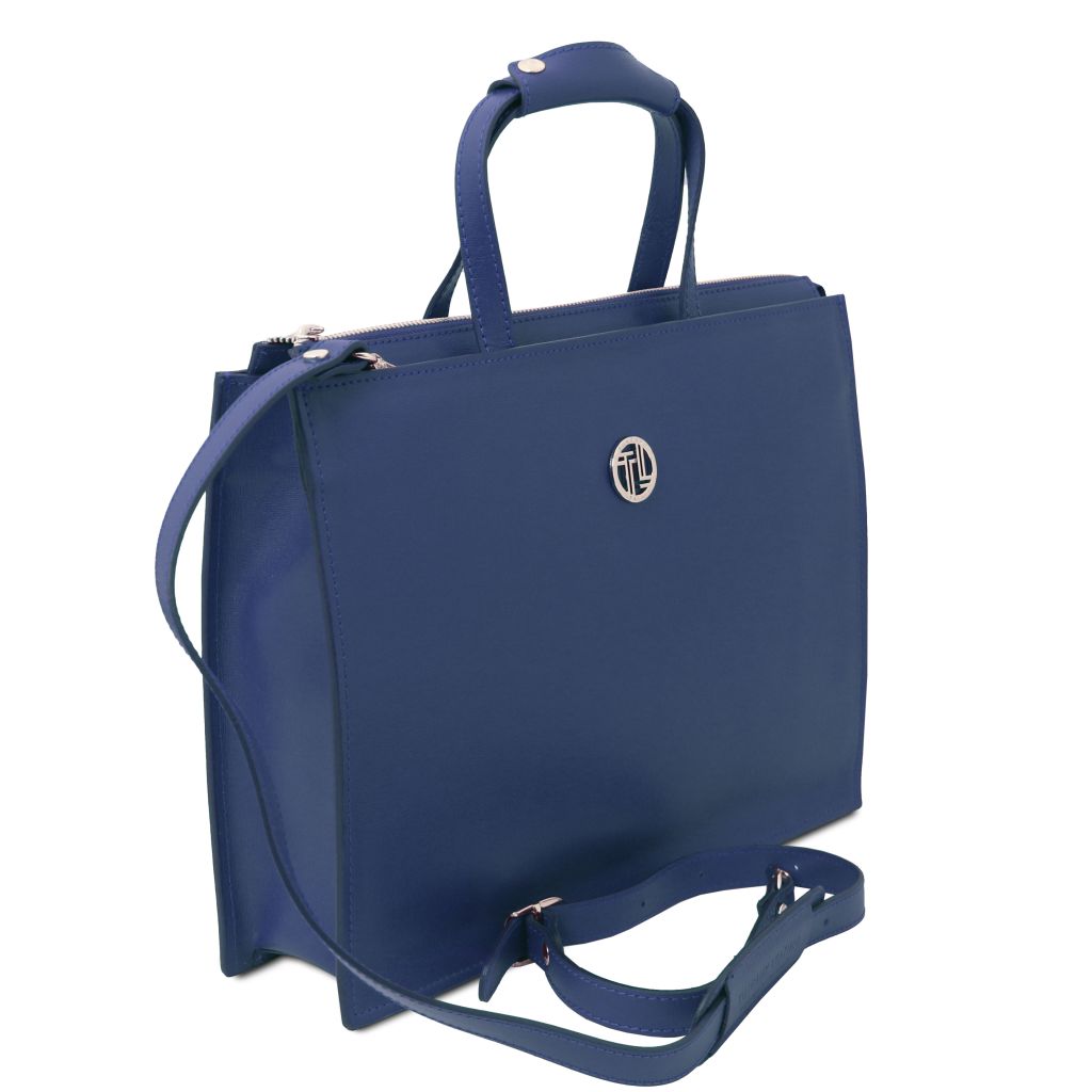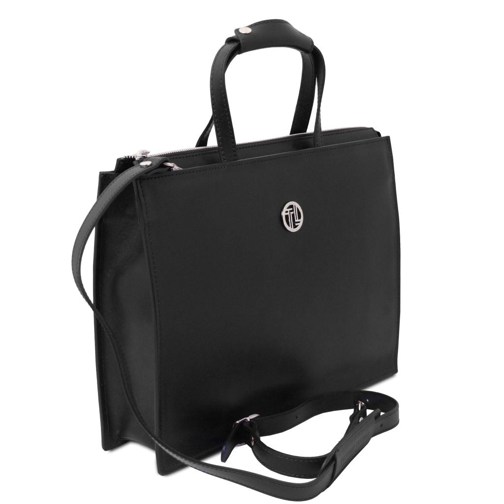 Den avtagbara och justerbara axelremmen i läder kan anpassas mellan 85 och 111 cm för bekväm användning över axeln eller crossbody. Handtaget har ett drop på 10 cm och ger ett stadigt grepp. Väskan stängs med robust dragkedja som skyddar innehållet, och den styva strukturen säkerställer att formen bibehålls även vid daglig användning.