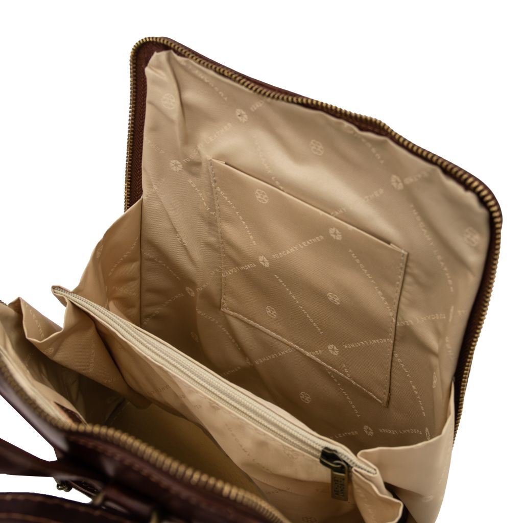 Tuscany Leather Paris är en elegant liten ryggsäck tillverkad i full grain-läder med en semirigid struktur som kombinerar stil och funktion. Den tidlösa designen lyfts av präglad logotyp på framsidan, frontficka med stängning och hårdvara i borstad mässing och silverton. En perfekt accessoar för dig som vill bära exklusiv kvalitet i ett kompakt format.