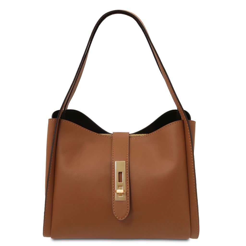 Tuscany Leather Soave är en elegant handväska tillverkad i mjukt full grain-läder med en semirigid struktur som kombinerar form och följsamhet. Den stilrena designen lyfts av guldfärgade detaljer, präglad logotyp och en exklusiv metallåsning som ger väskan ett sofistikerat uttryck. En tidlös modell som passar lika bra till vardag som till fest.