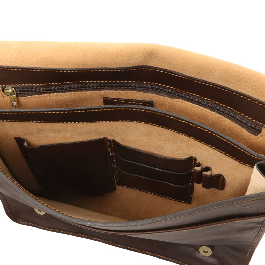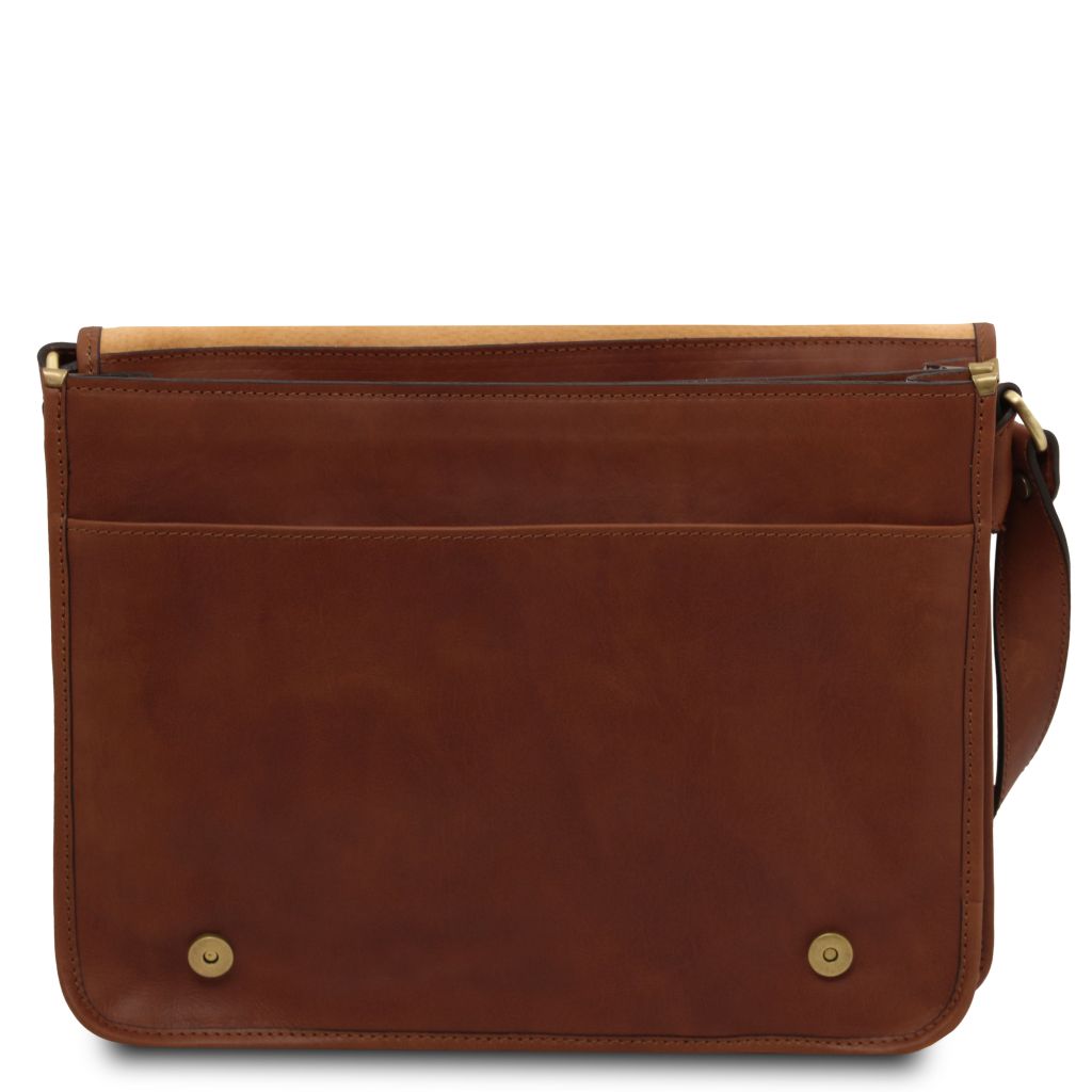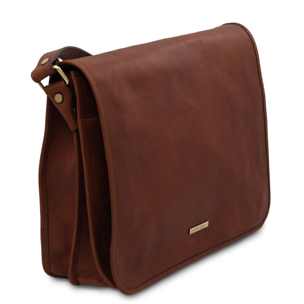 Tuscany Leather TL Messenger är en stilren axelremsväska i matt full grain handfärgat vegetabilgarvat läder. Väskan har en mjuk struktur som gör den bekväm att bära och anpassningsbar för daglig användning. På framsidan finns en praktisk ficka för snabb åtkomst, medan baksidan har en ficka med stängning för extra säkerhet. Metallogo och hårdvara i borstad mässing och silverton förstärker den eleganta och tidlösa designen.